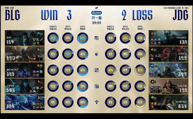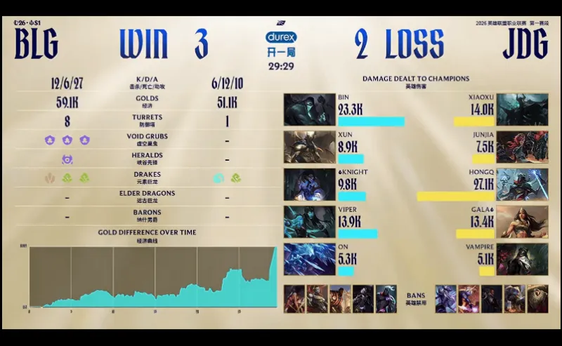 28分钟,JDG小龙接团彻底爆炸,BLG打出1换5,随后顺利一波